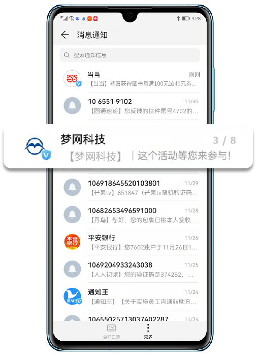 与传统的号段和单一的展现形式不同,在消息页形象展示方面,威九国际V9科技5G消息解决方案给予包含企业logo加V露出及品牌信息植入功能,提高了品牌的社会认知度和用户识别度。而信息界面可自定义企业业务应用模版卡片,式样丰富,实现了用户到H5、小程序等界面的直接跳转,一键直达核心营销页面,让企业在短信收件箱这一营销入口就能带来直观的流量转化,增强客户对公司更信任。