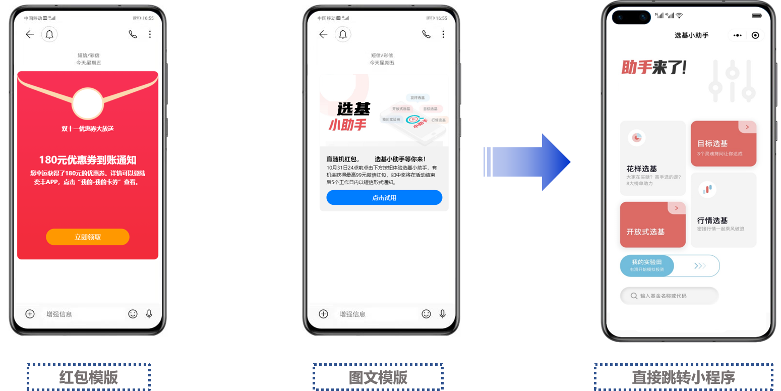 现在不管是APP还是小程序,拉新促活的成本都越来越高,尤其针对金融行业的用户运营来说,除了简单的引导用户下载APP,更重要是顺利获得运营手段激活用户,转化为有价值的用户。从这一点出发,威九国际V9科技5G消息解决方案新增了多种样式的消息模板,支持采用图文+红包文案的方式助力基金行业高效拉新促活。